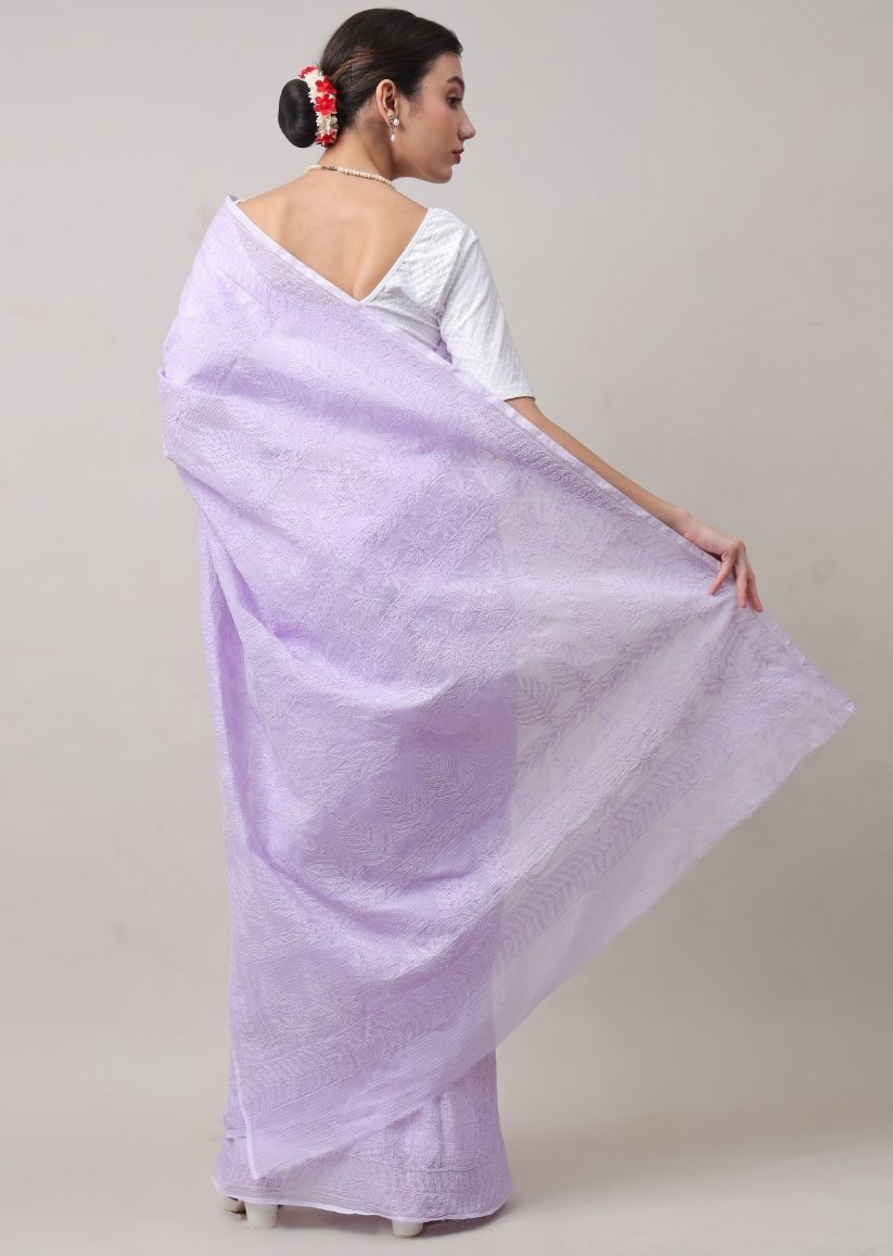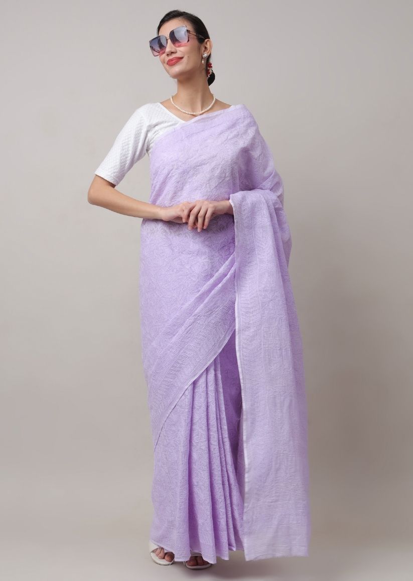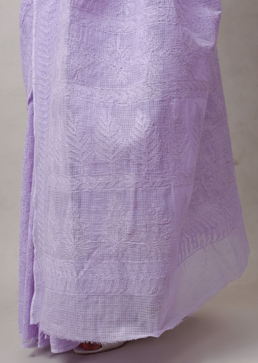 Firgun Lavender Lucknowi Chikankari Kota Doria Tepchi Work Saree with Blouse Piece