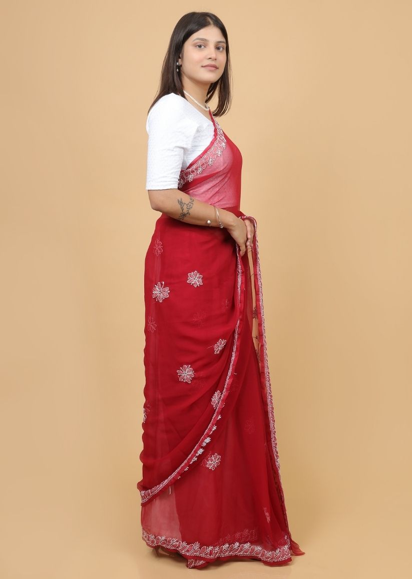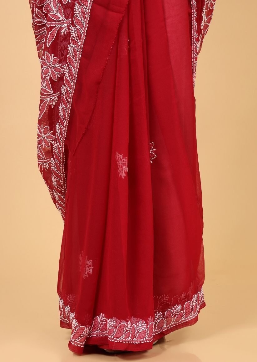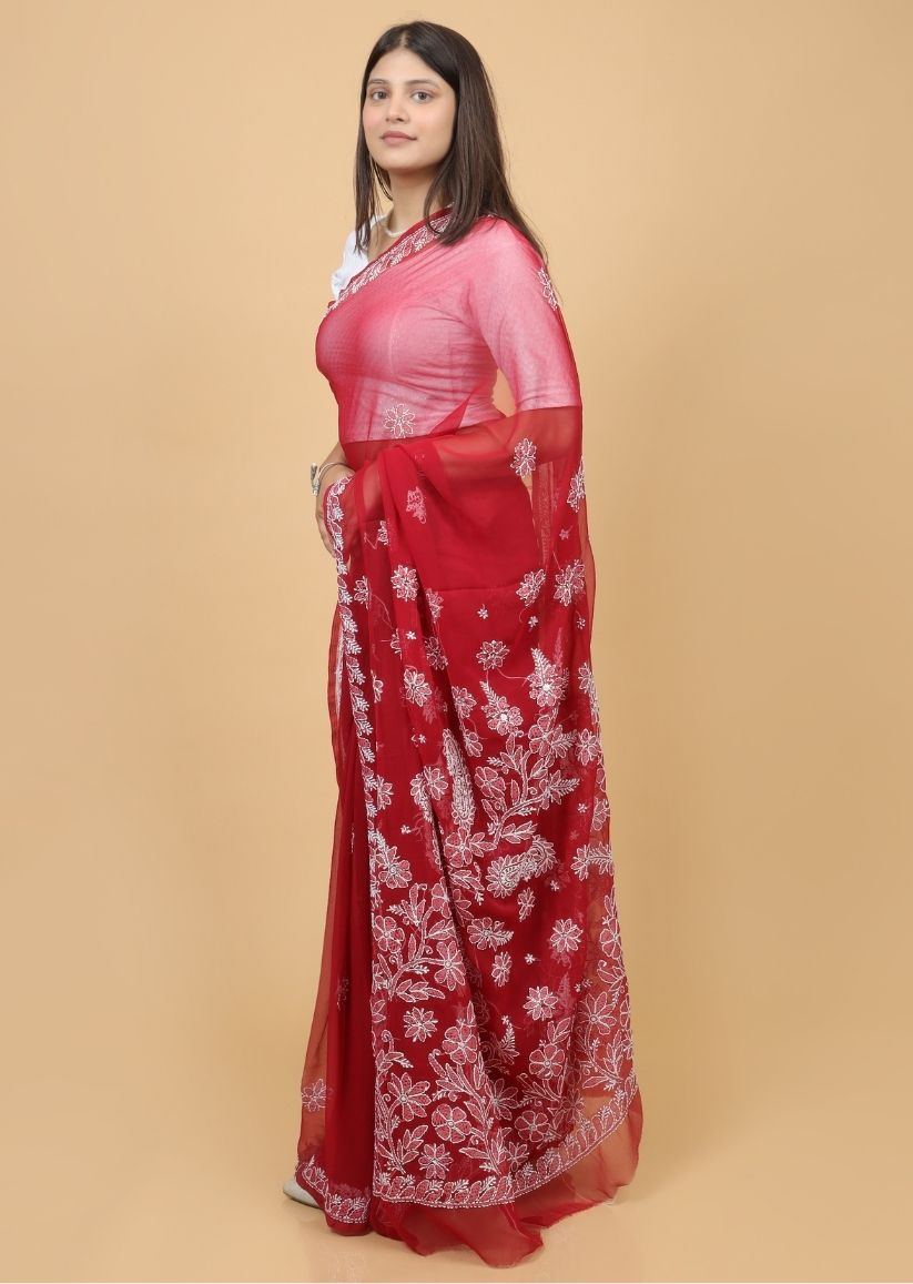Firgun Red Lucknowi Chikankari Georgette Saree with Unstitched Blouse Piece
