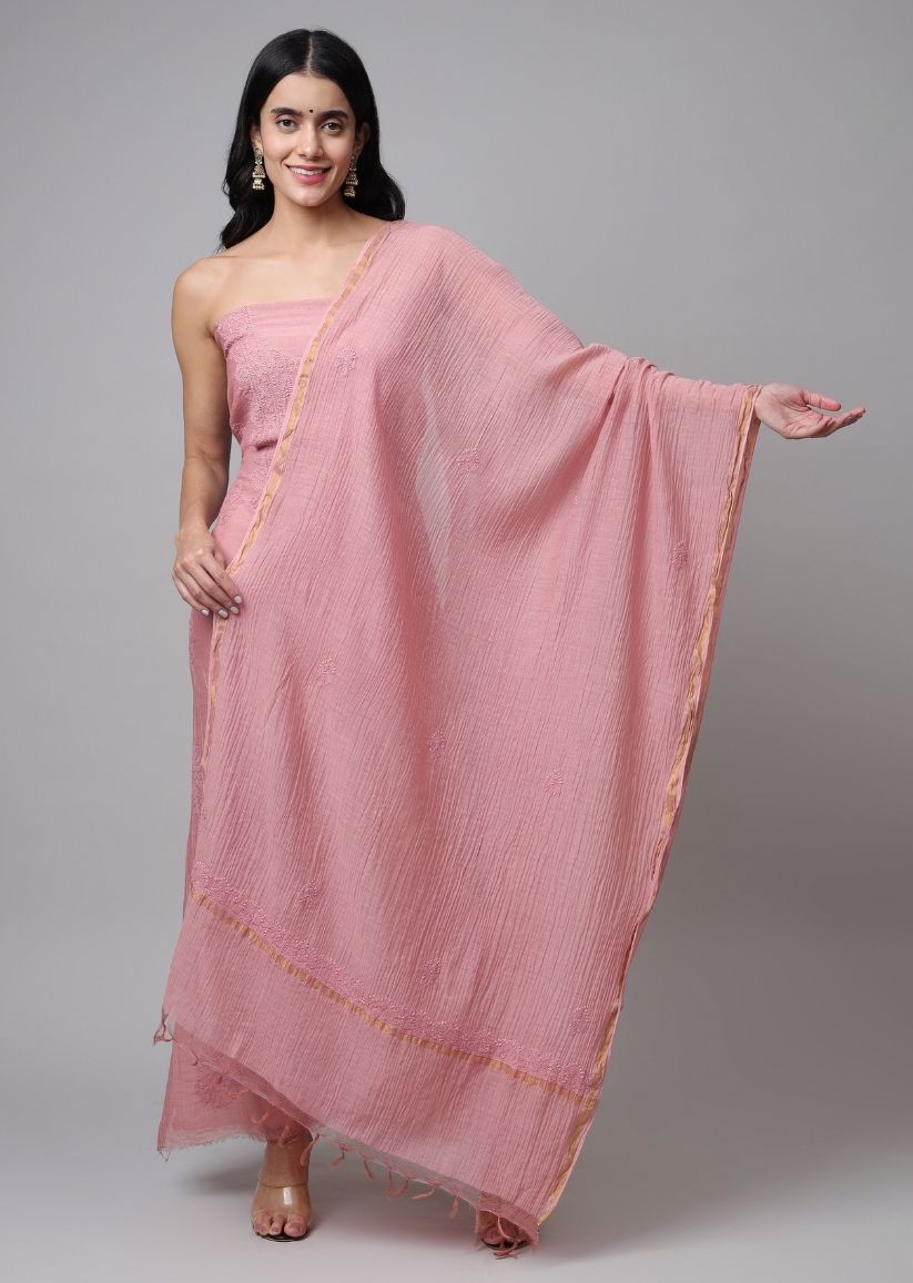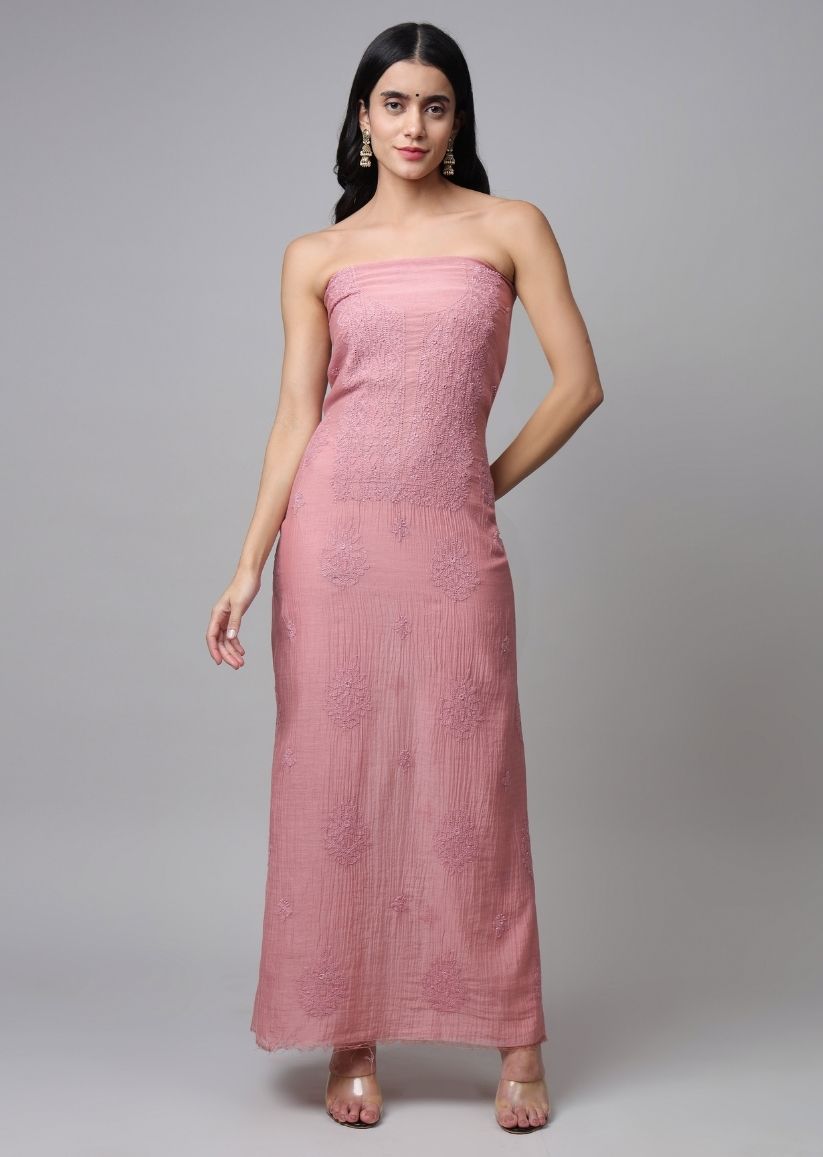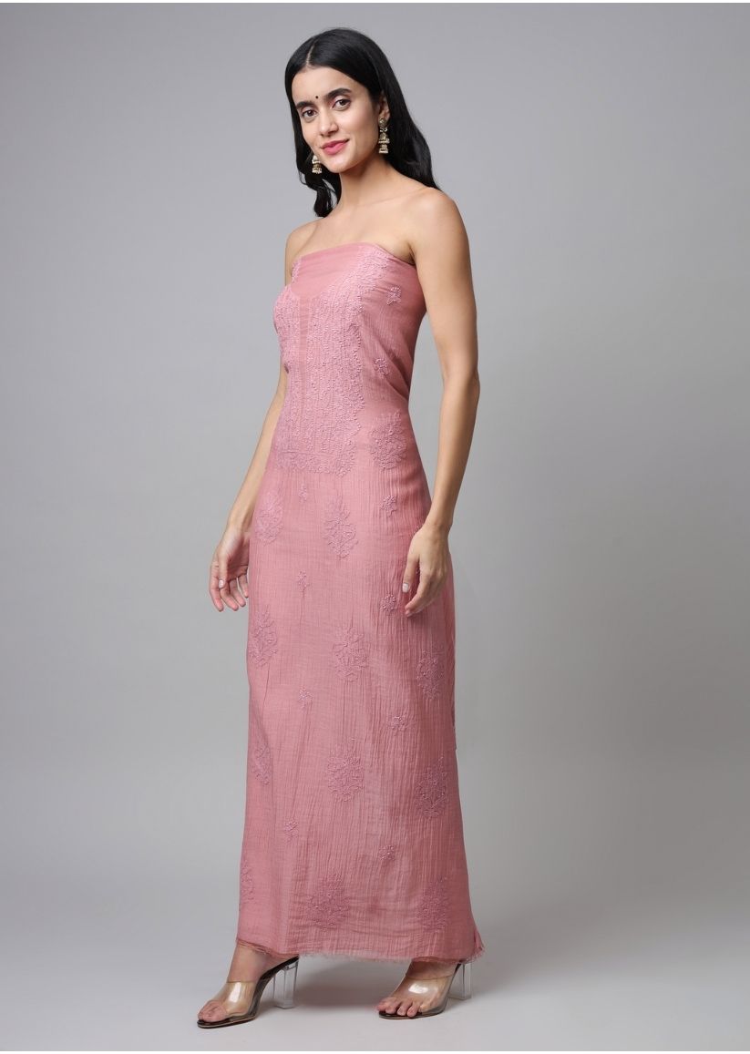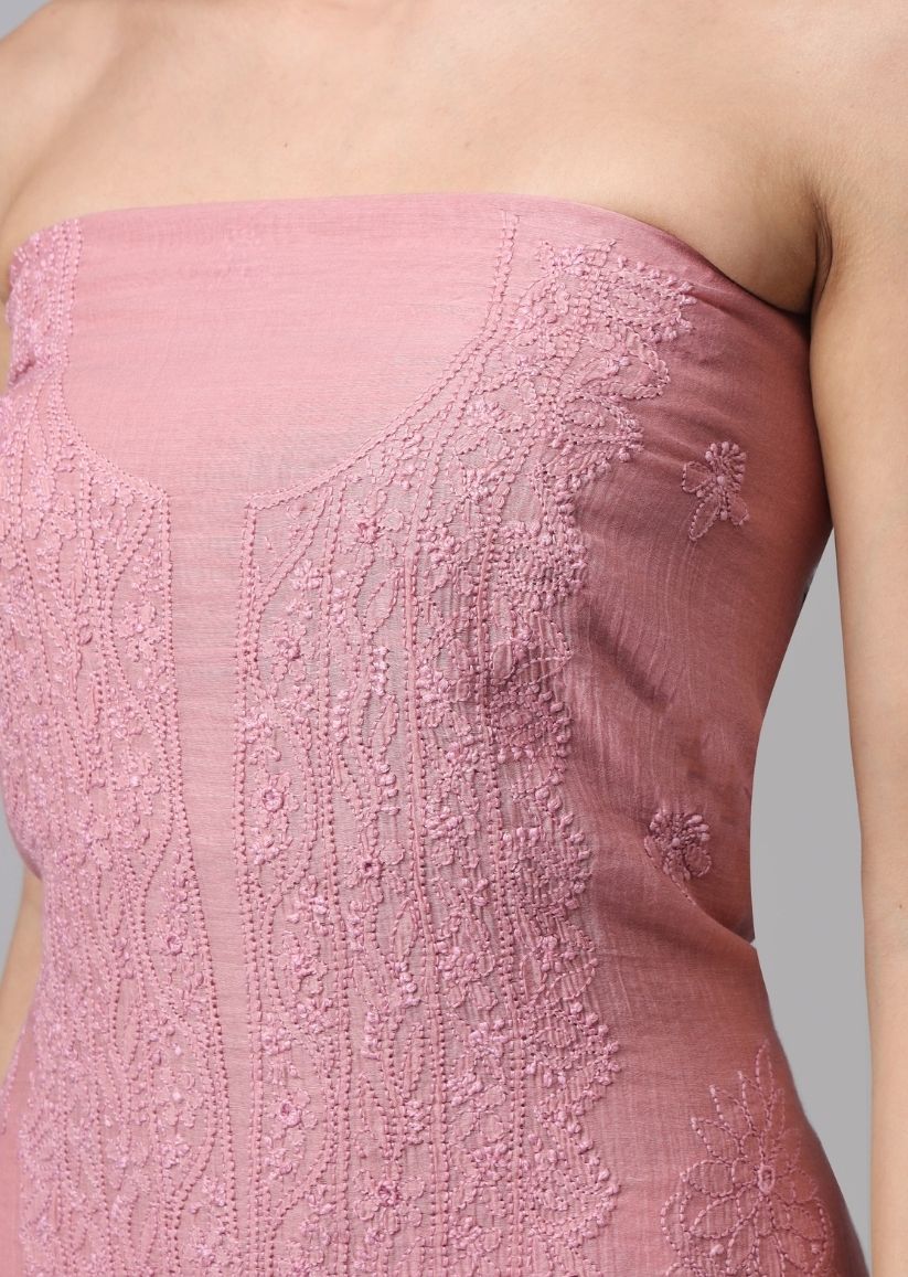 Firgun Rose Gold Lucknowi Chikankari Mul Chanderi Unstitched Kurta & Dupatta Set