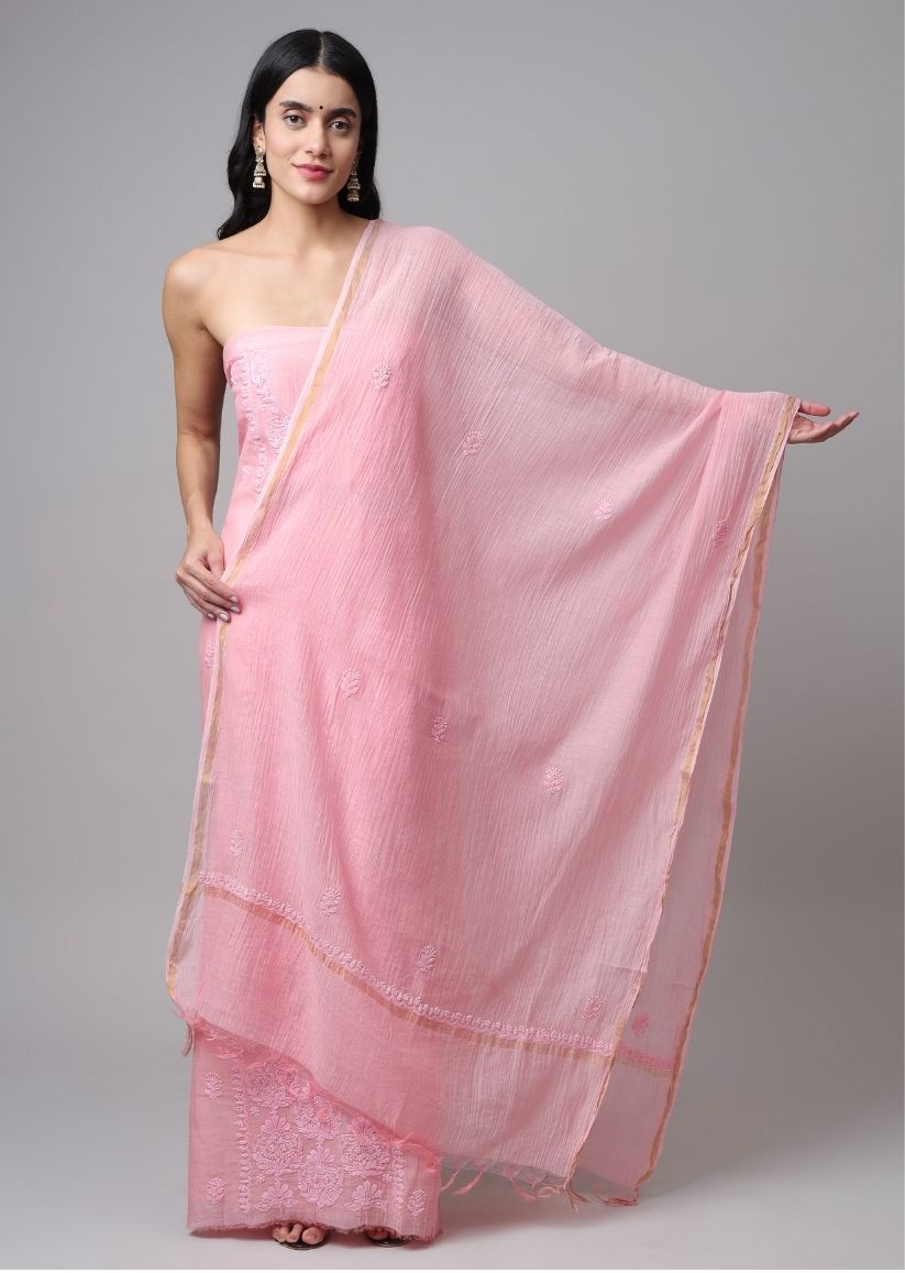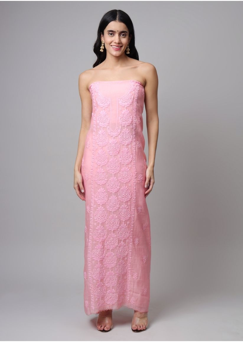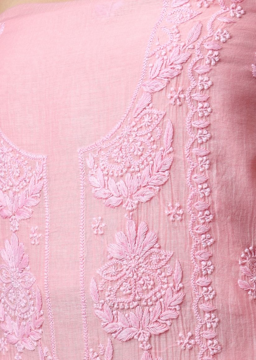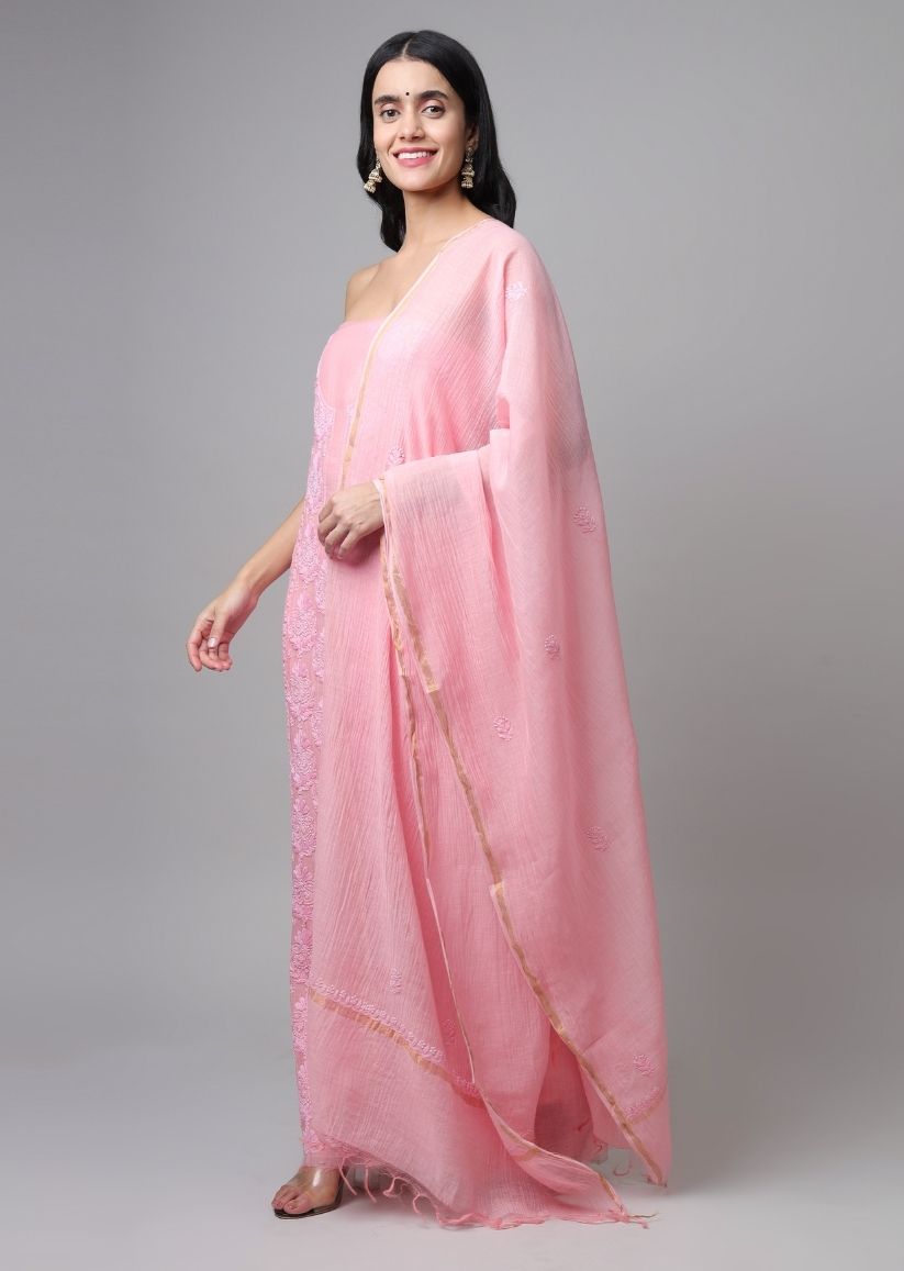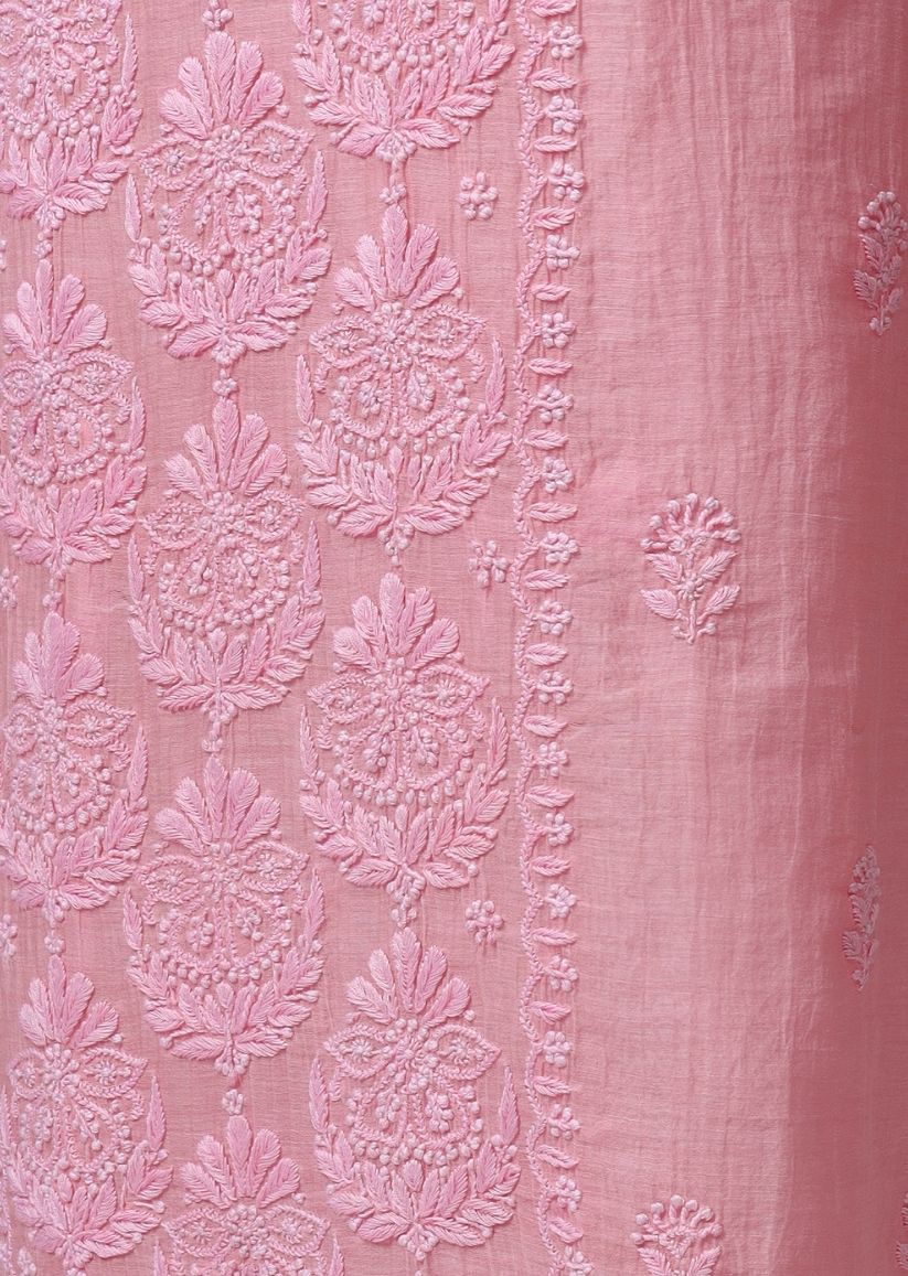 Firgun Rose Pink Lucknowi Chikankari Mul Chanderi Unstitched Kurta & Dupatta Set