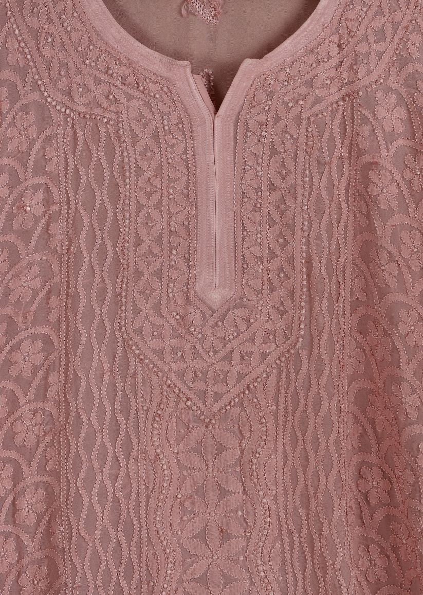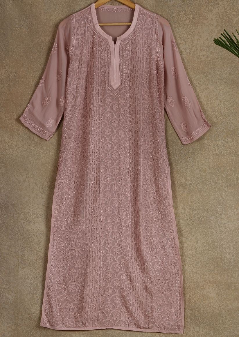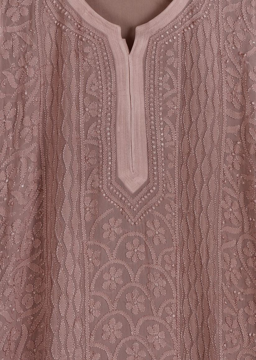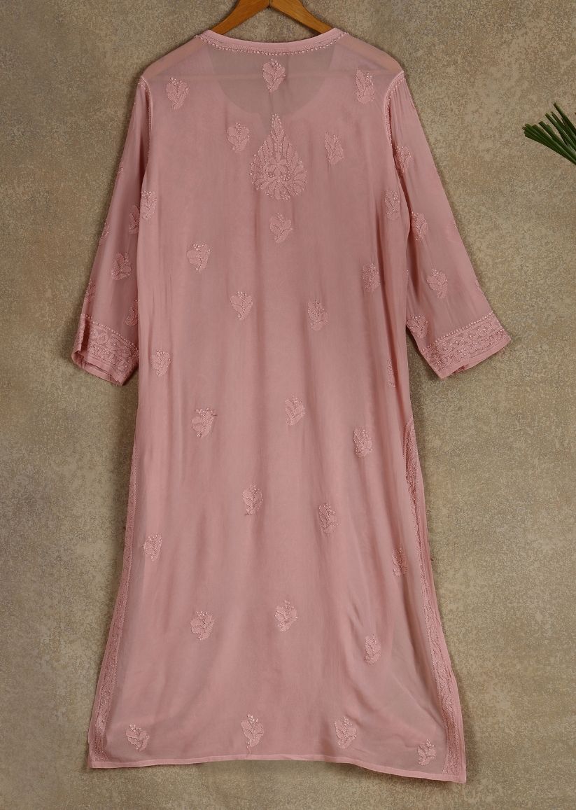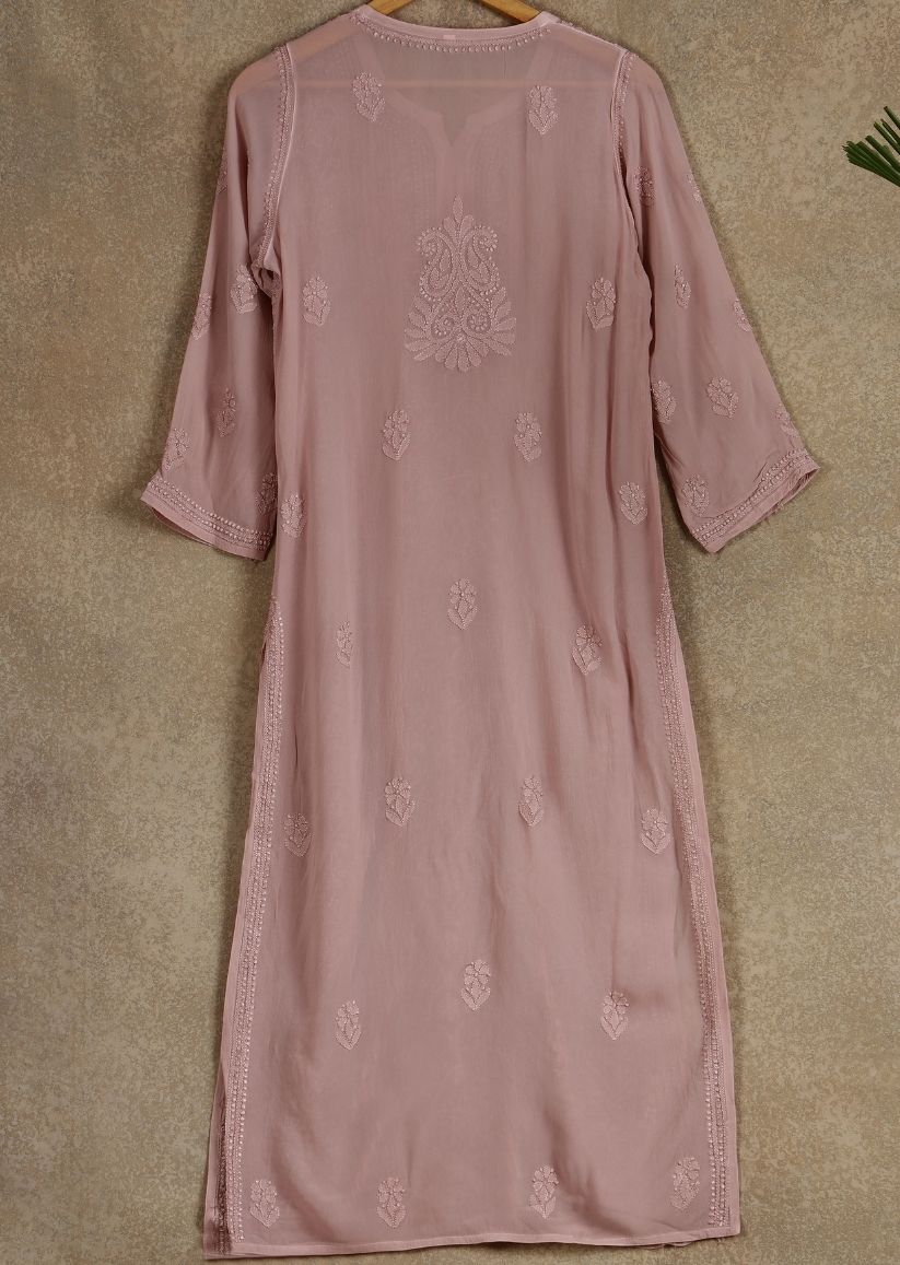 Crafted in premium viscose georgette, this elegant kurta comes in a soft and graceful hue. The piece is adorned with hand-embroidered chikankari using tone-on-tone resham thread, featuring delicate bakhiya, phanda, and keel kangan stitches.