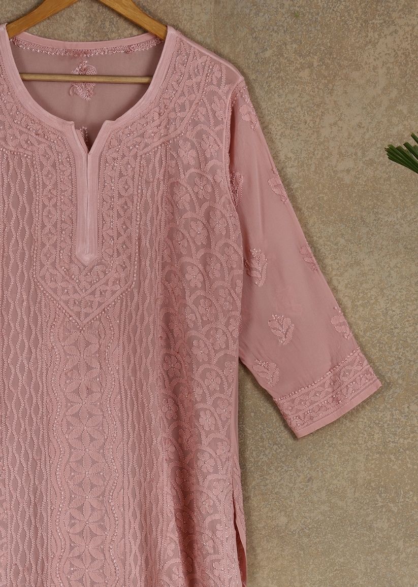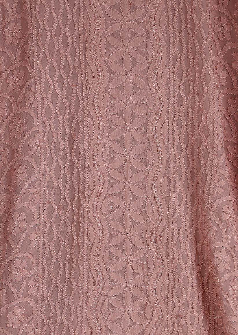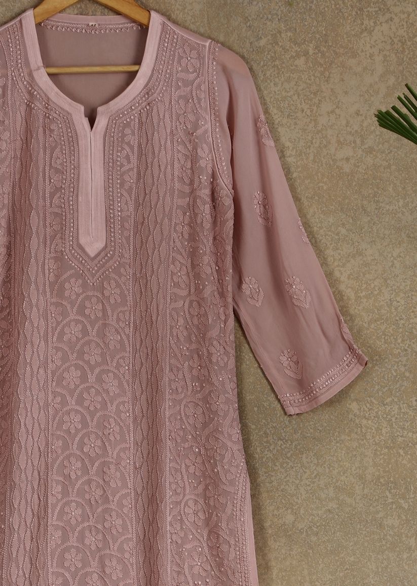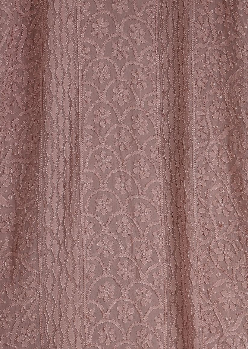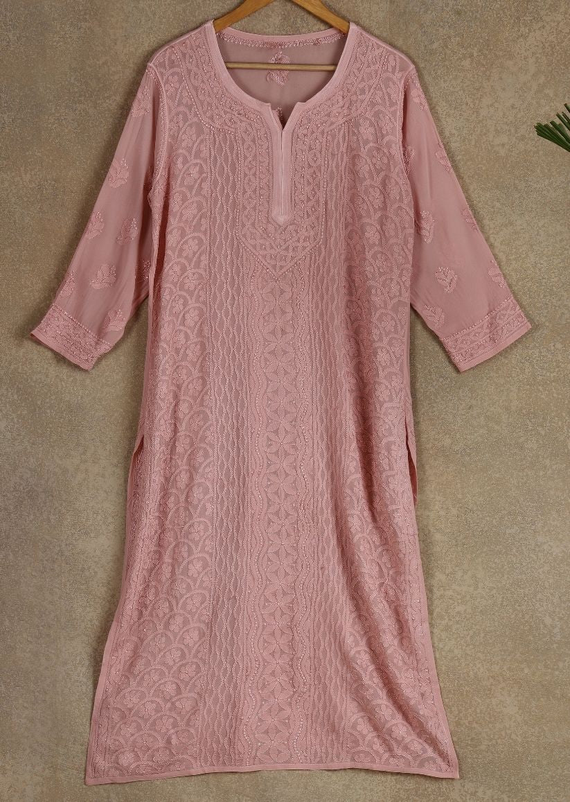 Crafted in premium viscose georgette, this elegant kurta comes in a soft and graceful hue. The piece is adorned with hand-embroidered chikankari using tone-on-tone resham thread, featuring delicate bakhiya, phanda, and keel kangan stitches.