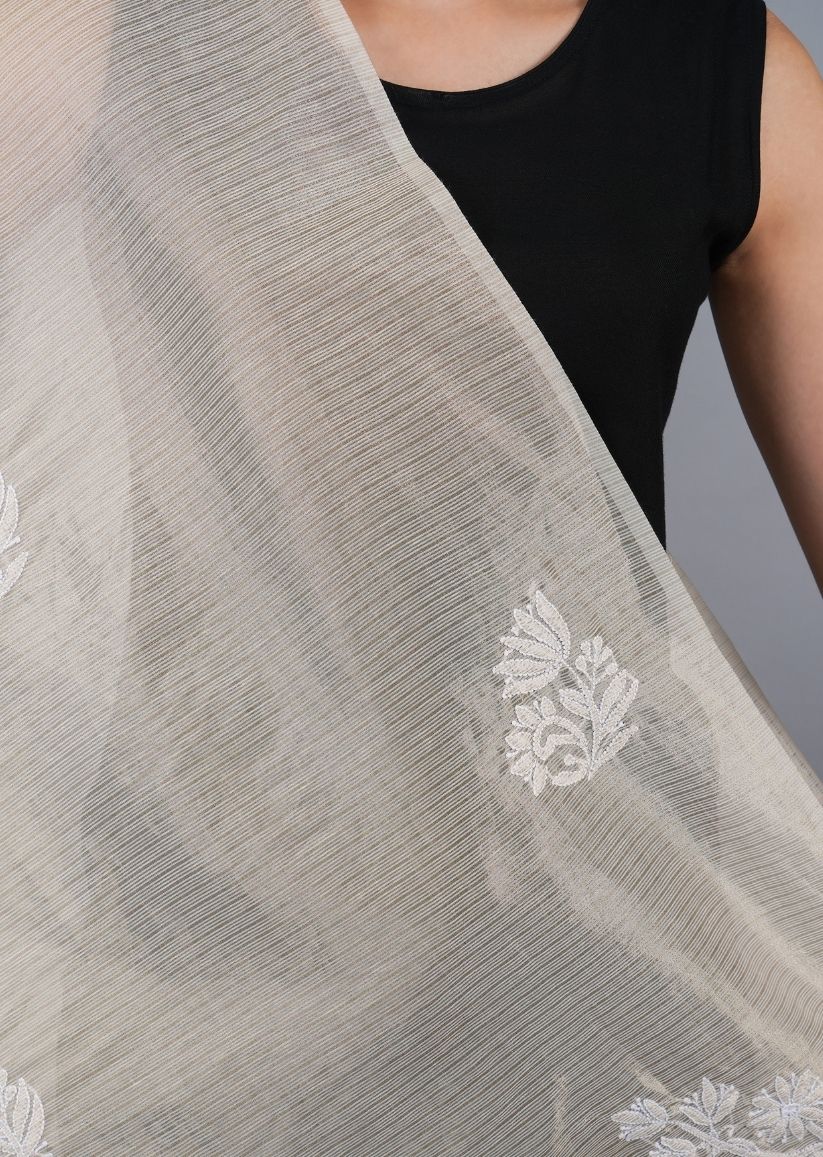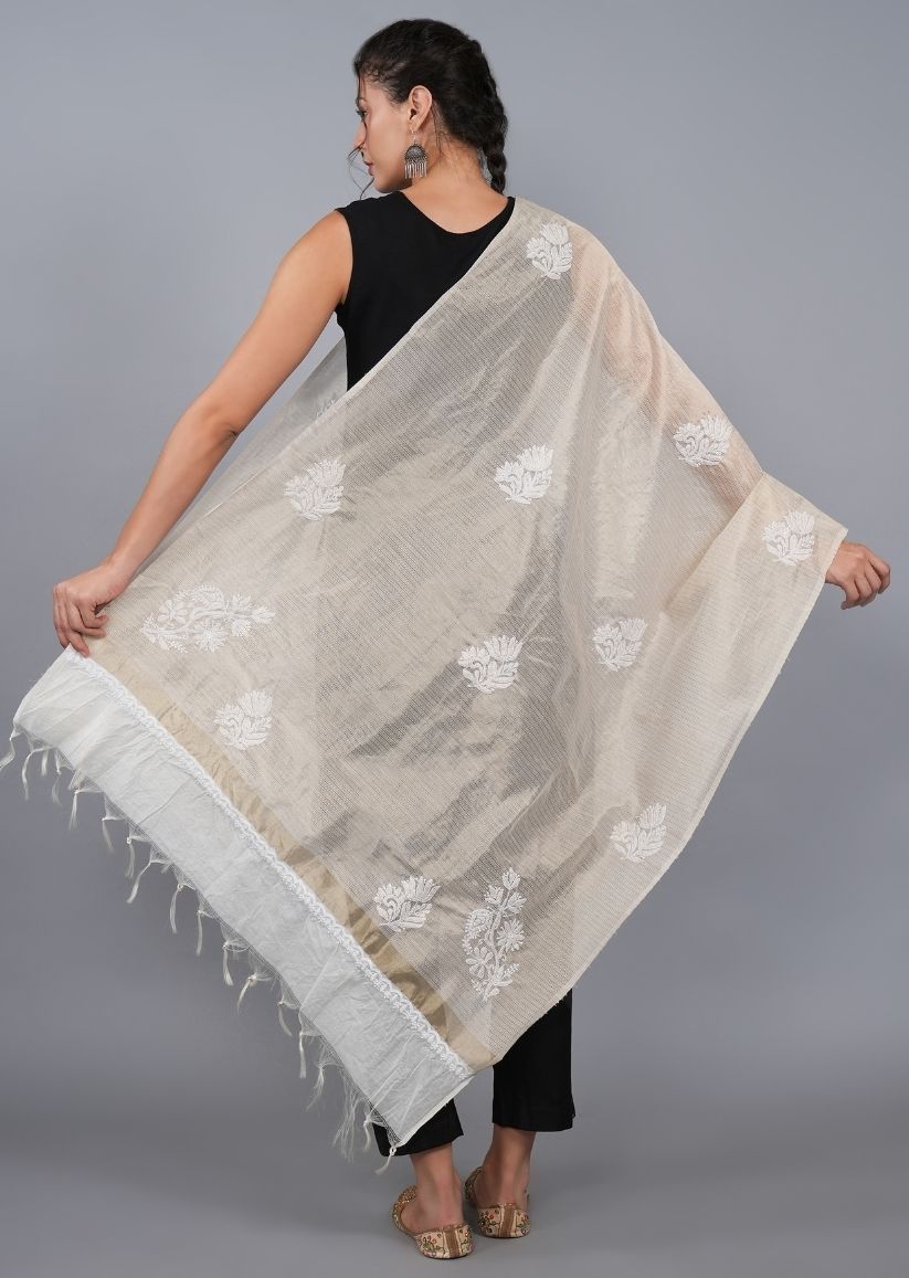 Firgun White & Gold Lucknowi Chikankari Tissue Chanderi Dupatta