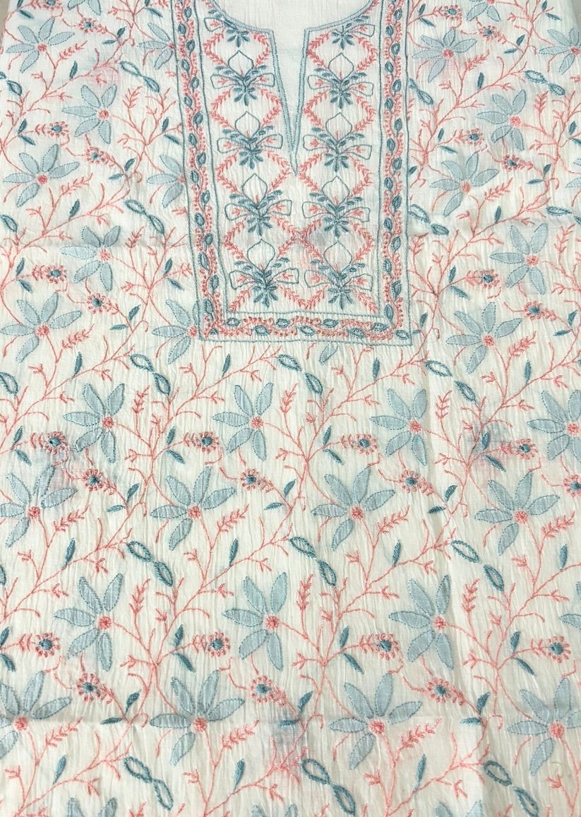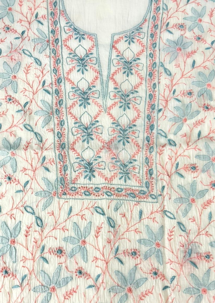 Firgun White Multi Colour Lucknowi Chikankari Mul Chanderi Unstitched Kurta & Dupatta Set