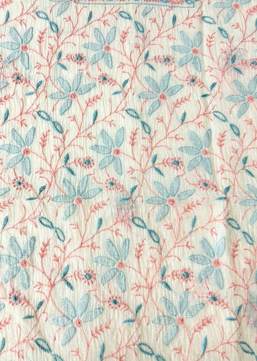 A timeless piece from Firgun’s premium collection, this exquisite white mul chanderi suit set celebrates the heritage of authentic chikankari in its most refined form. Handcrafted by skilled artisans, it features extremely fine embroidery in peach and blue threads on a pristine white base — a combination that exudes understated elegance.
