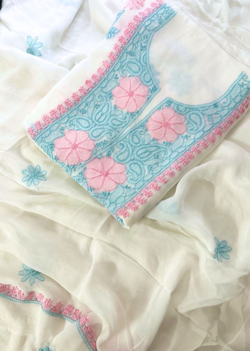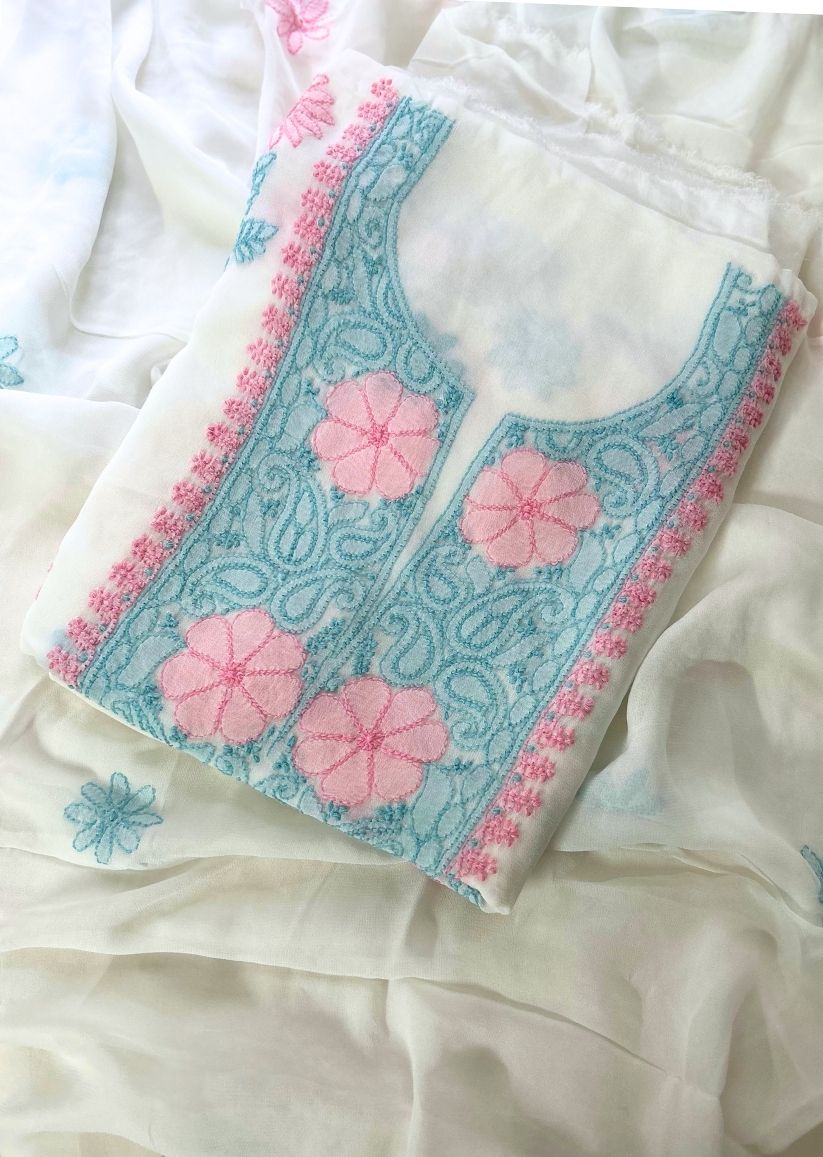 An elegant choice, this white viscose georgette suit set is adorned with hand-embroidered Lucknowi Chikankari in pink and blue threads.