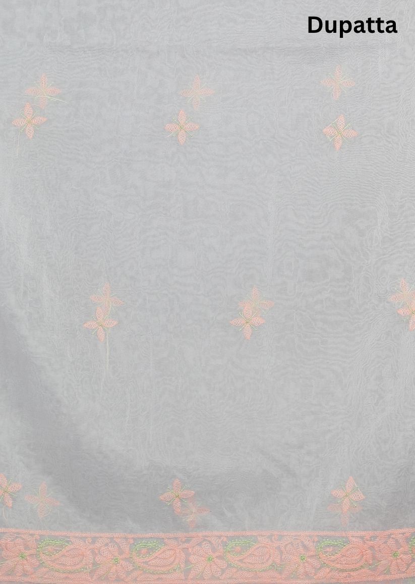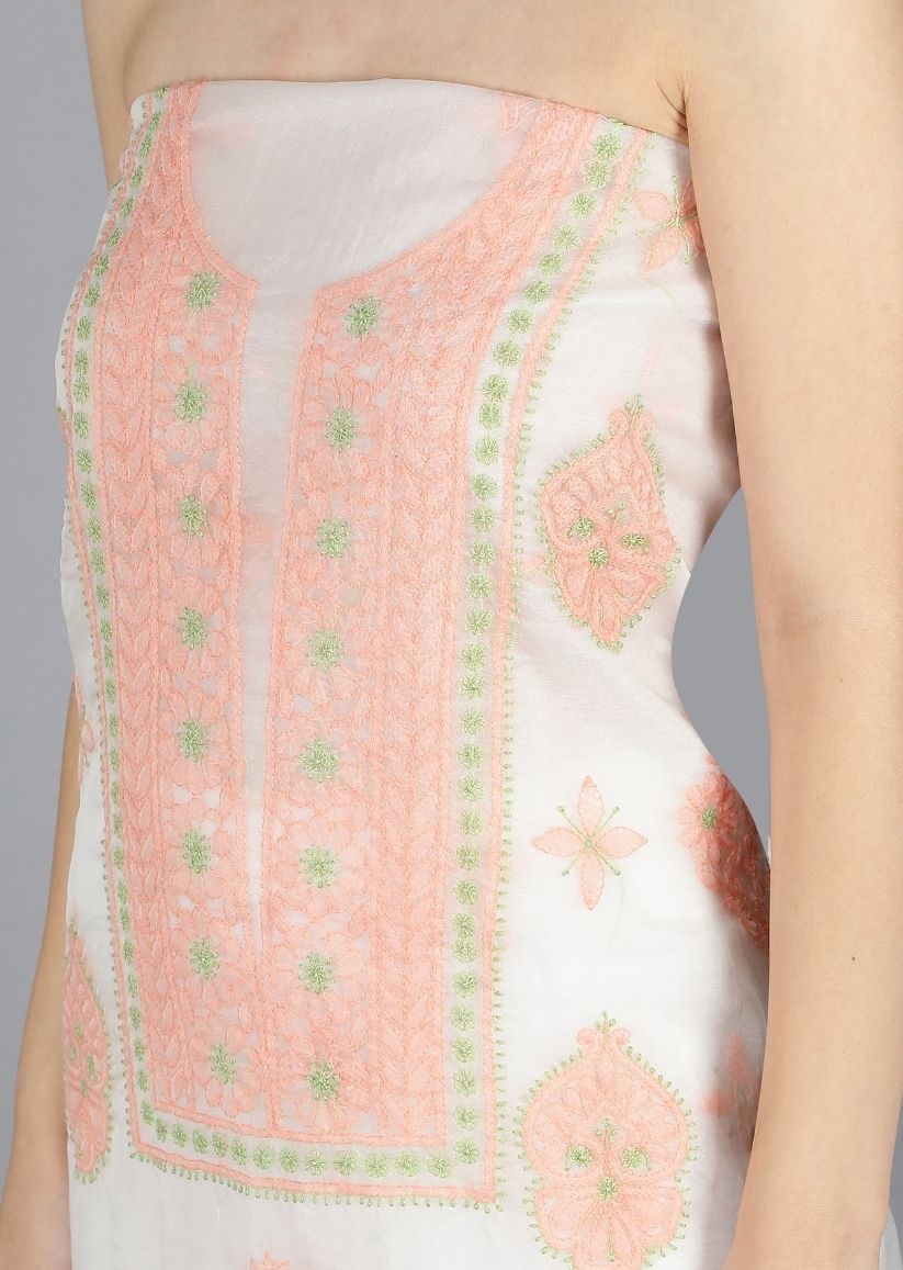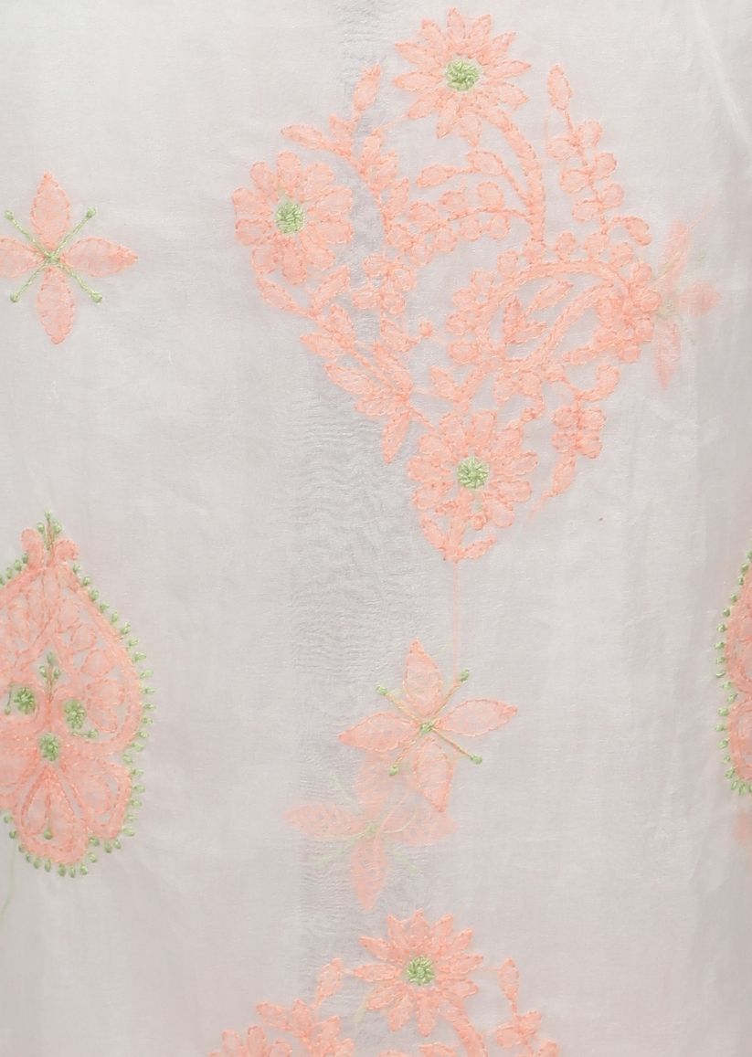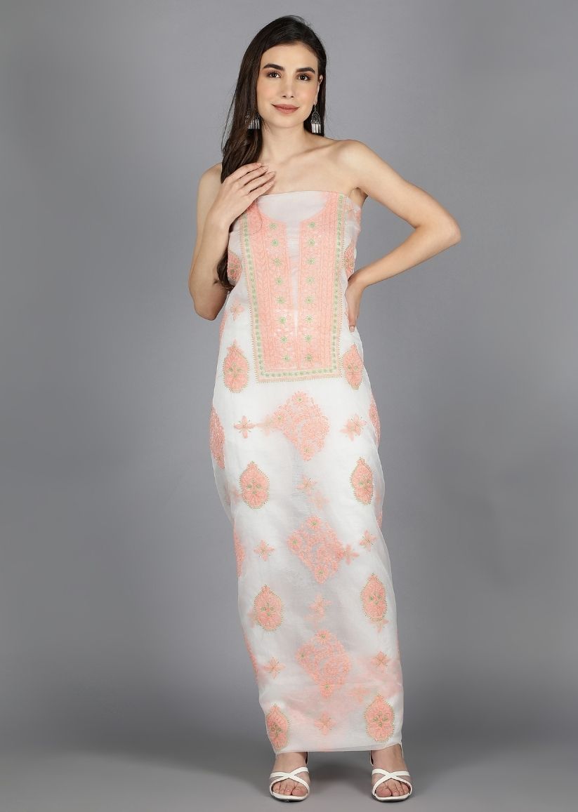 Firgun White & Orange Lucknowi Chikankari Organza Unstitched Kurta & Dupatta Set
