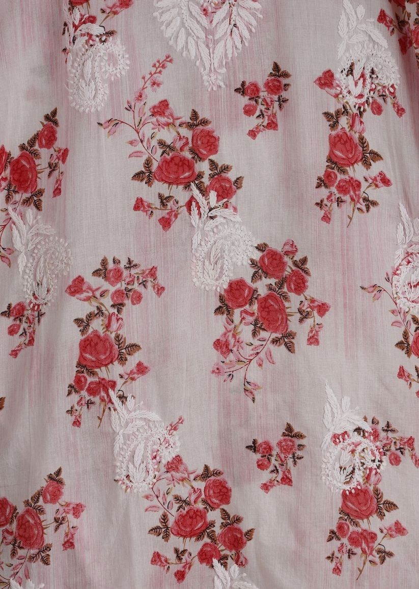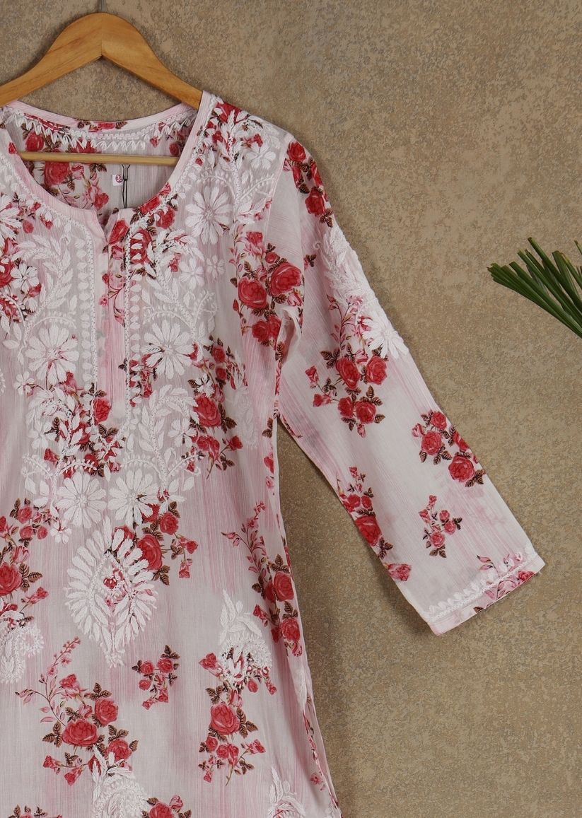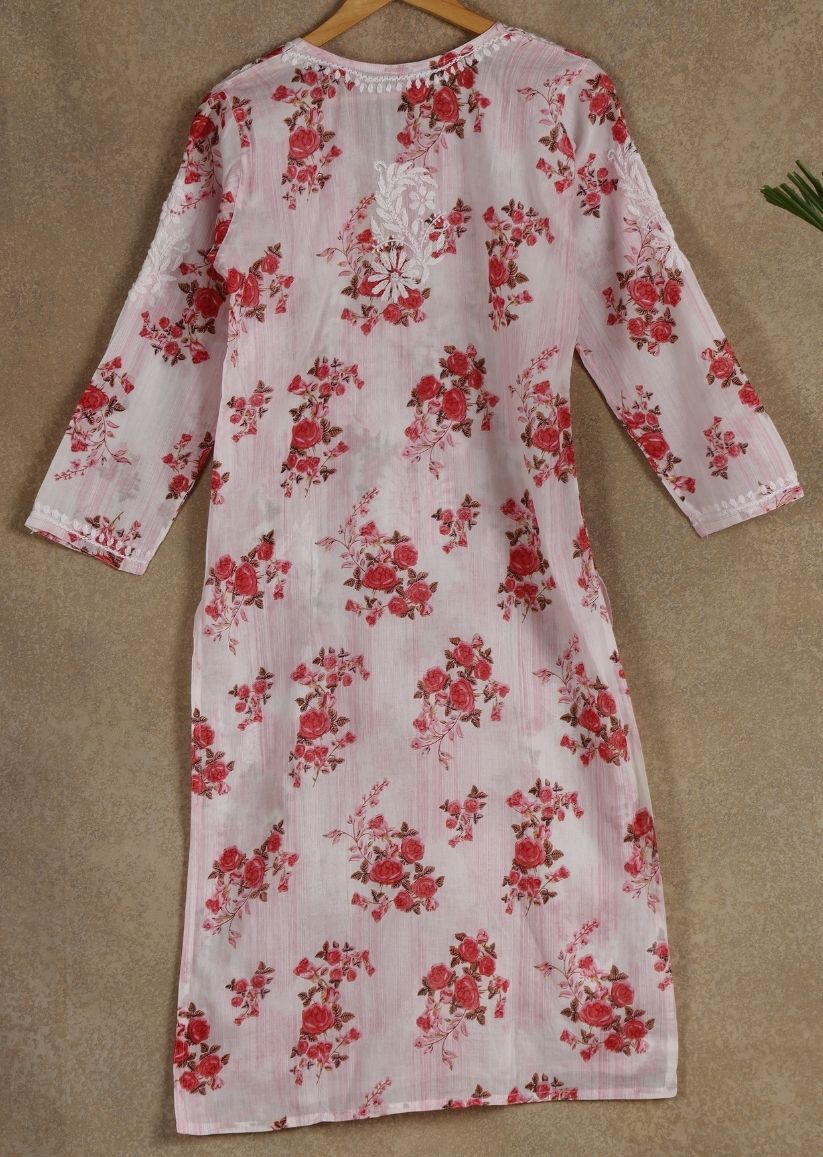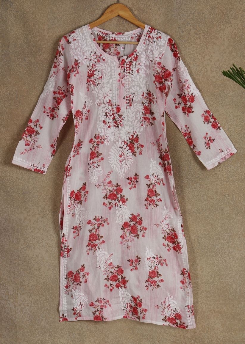 Crafted in soft breathable cotton, this stitched kurta comes in a soothing white and pink printed base adorned with hand-embroidered Lucknowi Chikankari. The embroidery features neatly executed phanda, bakhiya, and ghaaspatti stitches, giving it a refined finish.