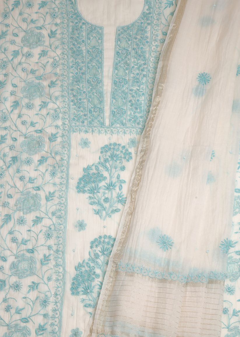 Firgun White & Turquoise Lucknowi Chikankari Mul Chanderi Unstitched Kurta & Dupatta Set