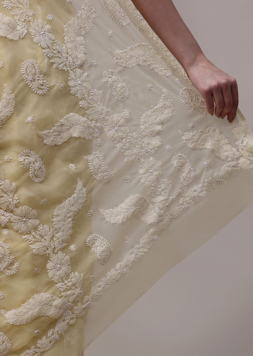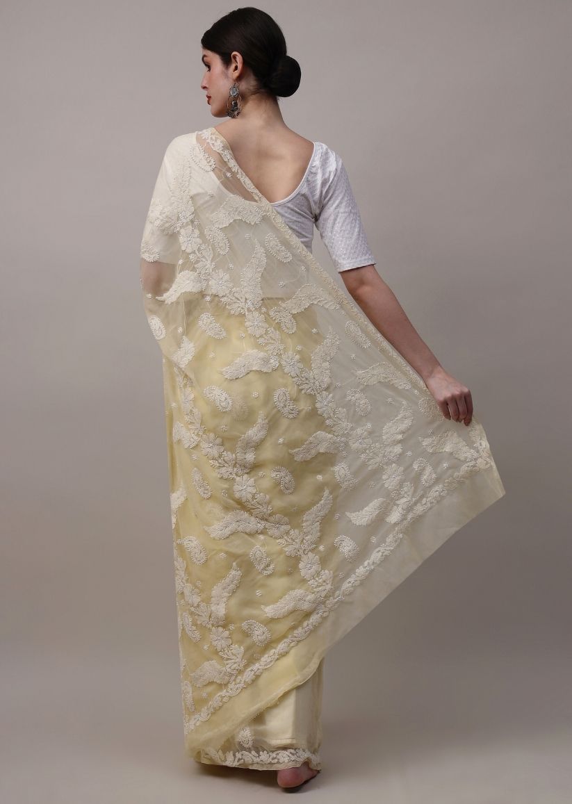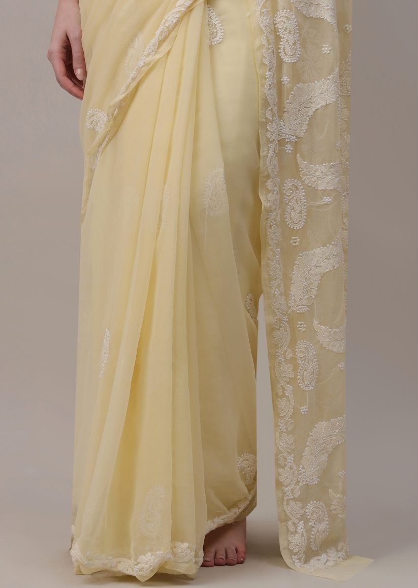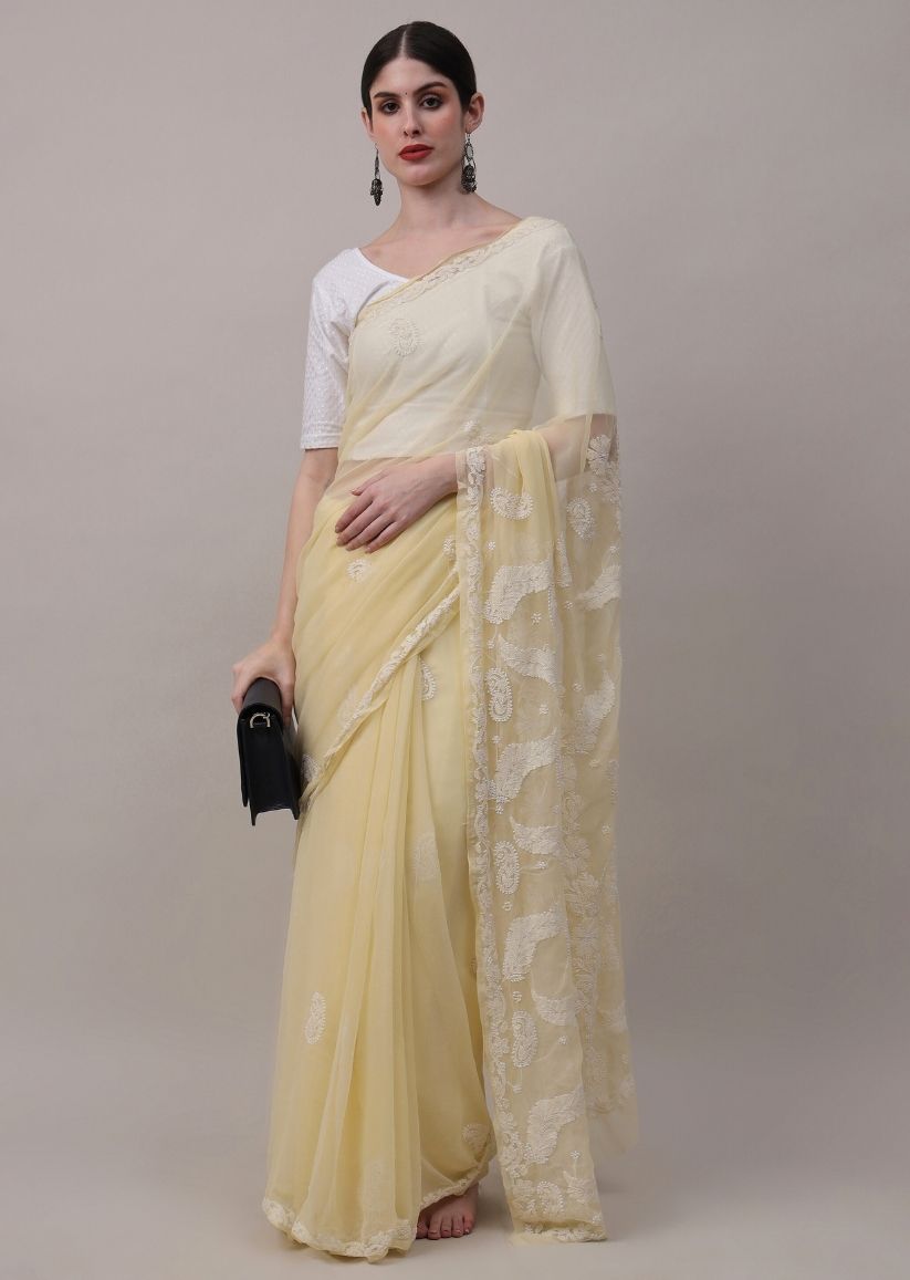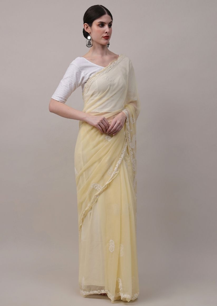 Firgun Mustard Yellow Lucknowi Chikankari Georgette Saree with Unstitched Blouse Piece