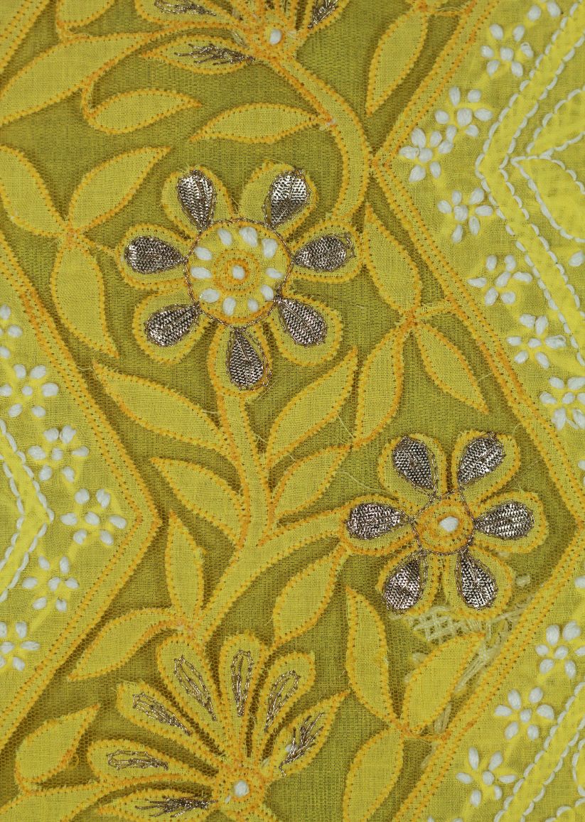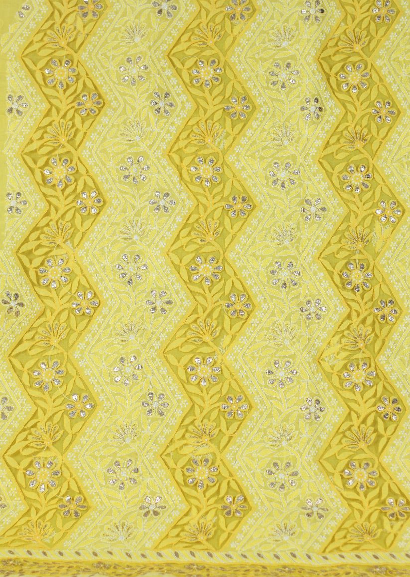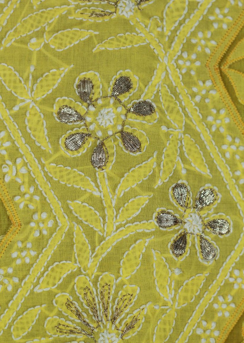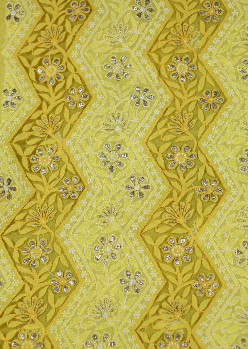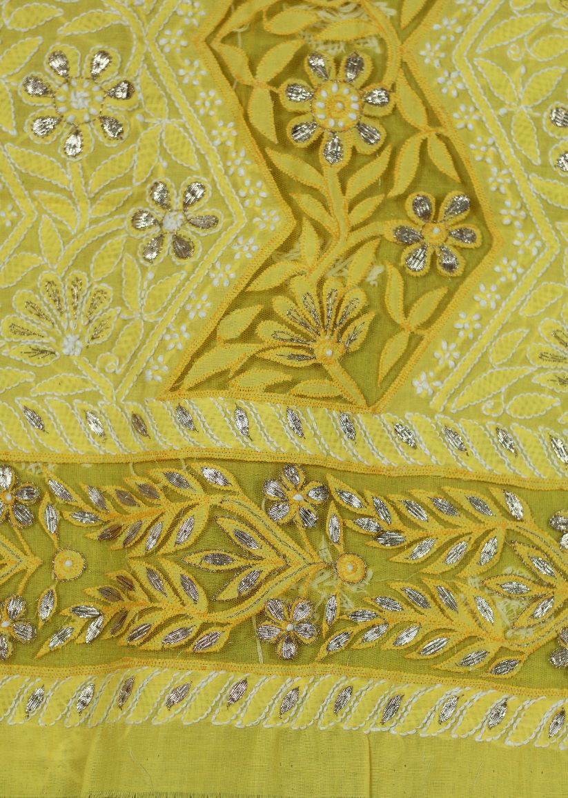 A cheerful and versatile piece, this Yellow Cotton Kurta fabric is adorned with hand-embroidered Lucknowi chikankari and highlighted with gota patti work for a touch of festive charm.
