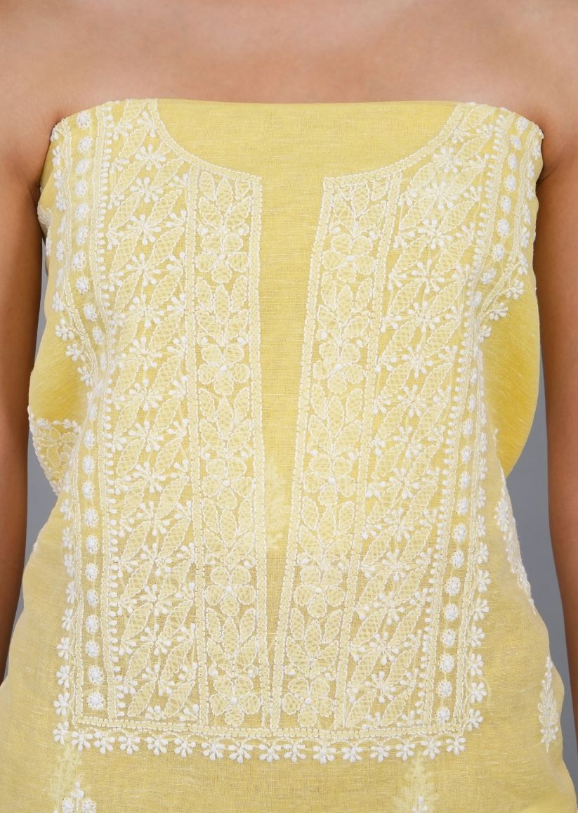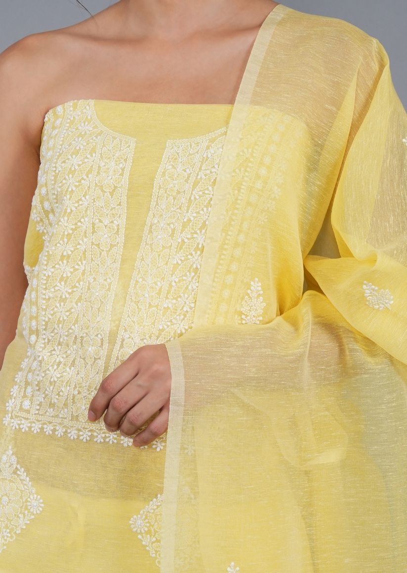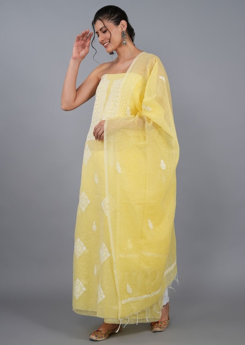 Bright, airy, and effortlessly elegant, this yellow unstitched Lucknowi chikankari kurta-dupatta set is crafted in breathable linen fabric, perfect for comfort and style in warm weather.