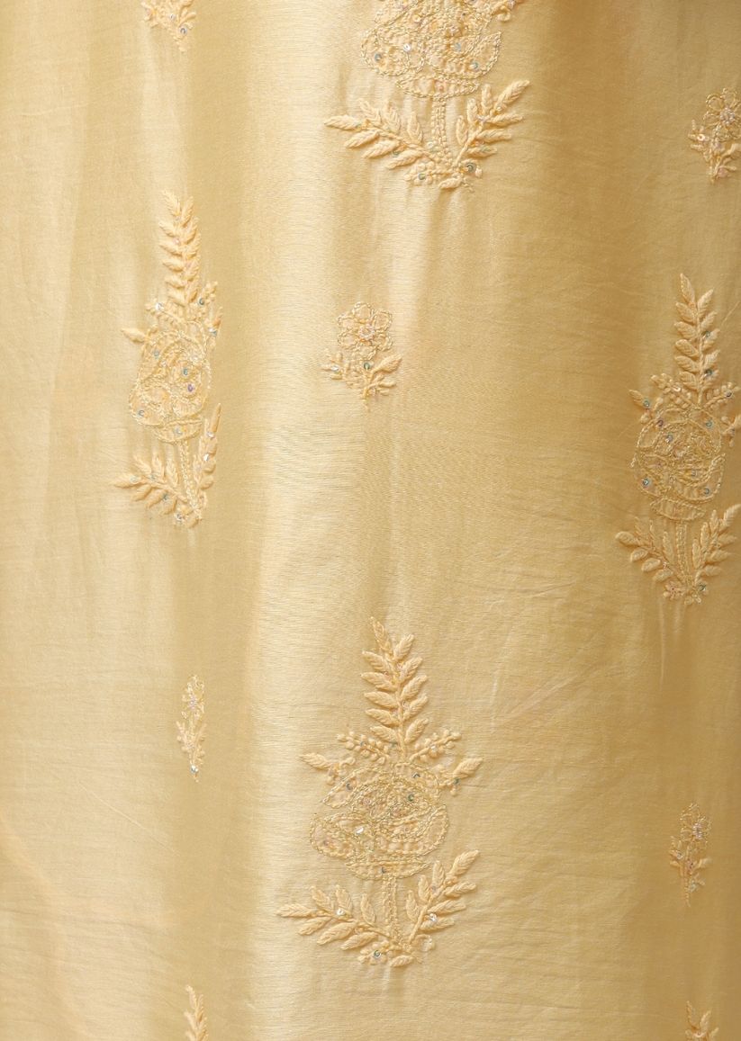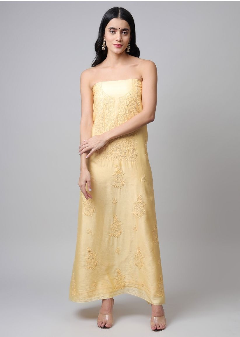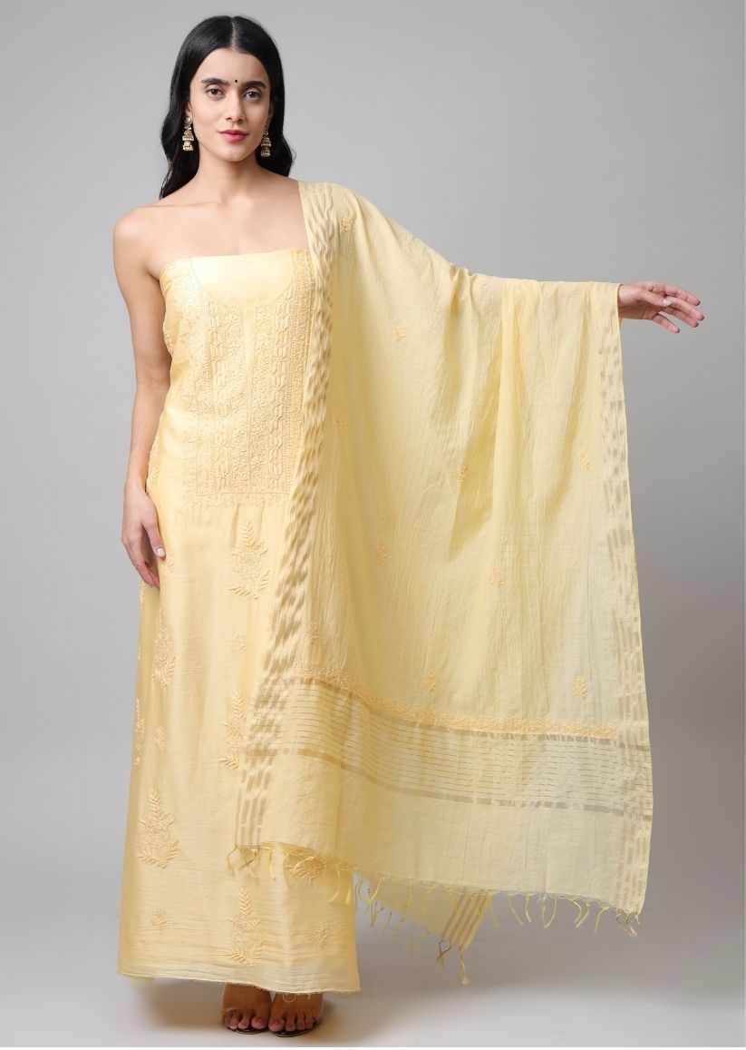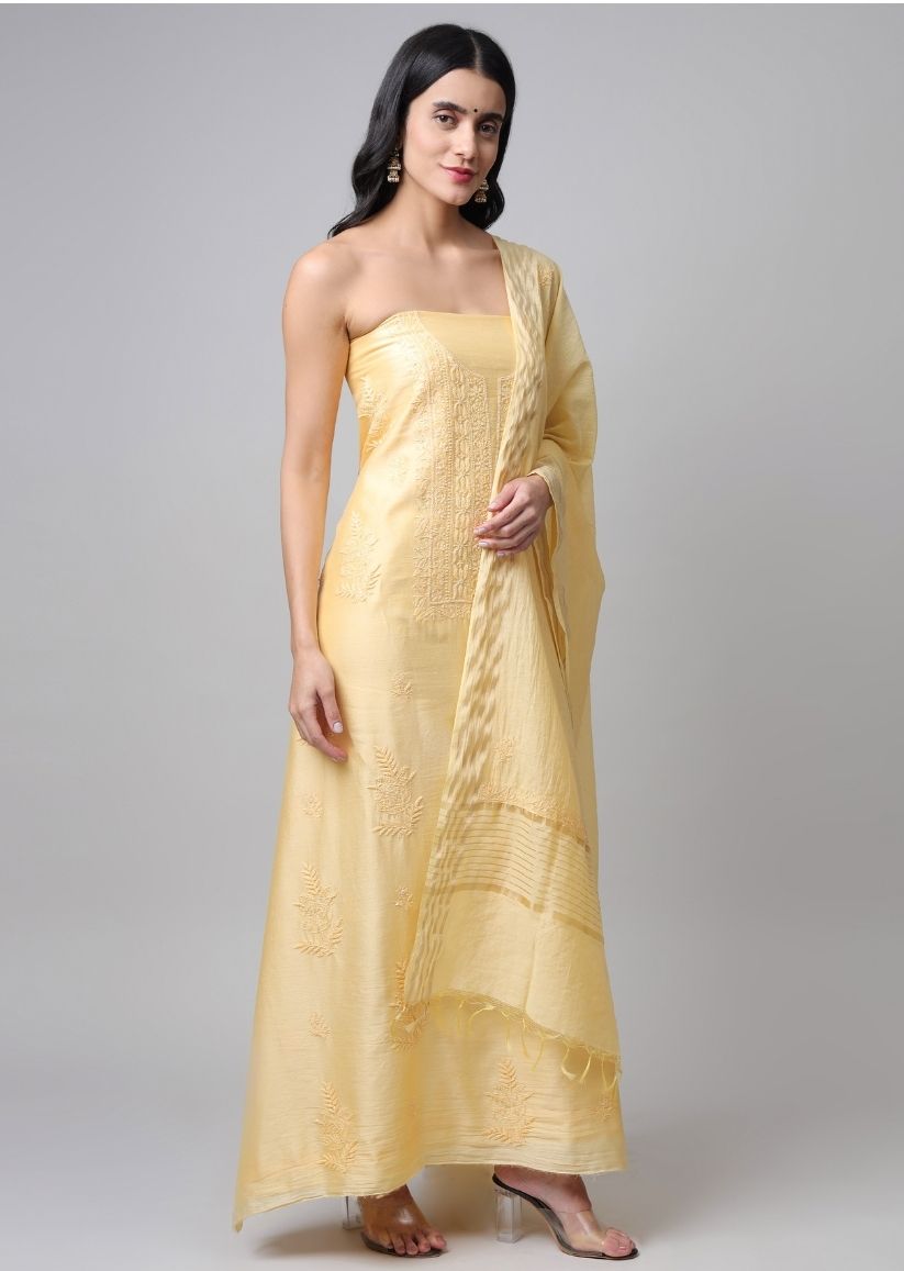 Firgun Yellow Lucknowi Chikankari with Pearl Work Chanderi Unstitched Kurta & Dupatta Set
