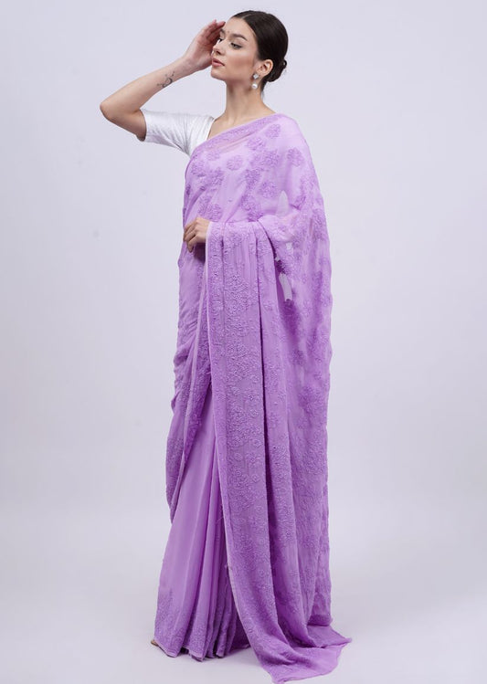 Firgun Lavender Lucknowi Chikankari Viscose Georgette Saree with Unstitched Blouse Piece
